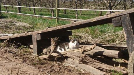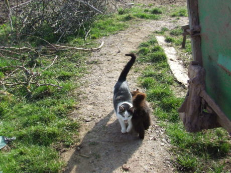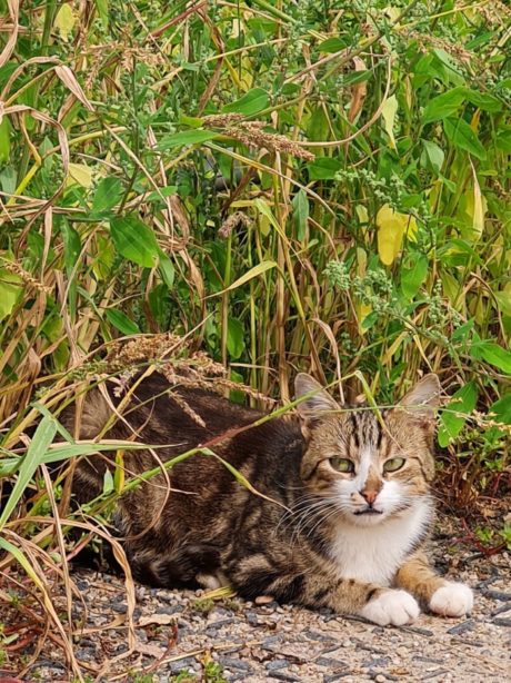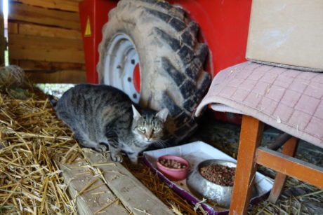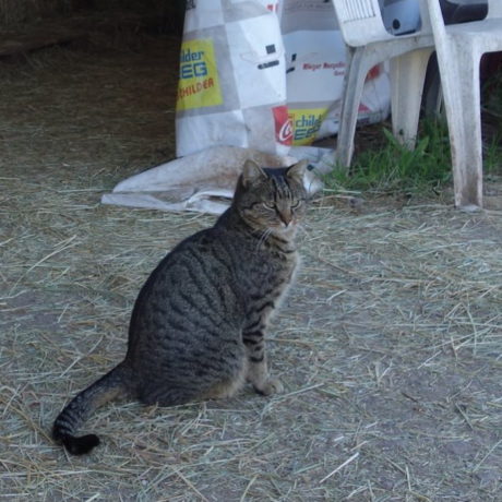 Sie sind halbwilde, in der Freiheit geborenen Katzen, die sich (ausser beim Füttern) nicht anfassen lassen und so leider nicht vermittelbar sind. Von der Tierinsel in Bornheim, die sich solcher Katzen annimmt haben wir diese Wilden als “Kammerjäger” zu uns genommen. In unseren Heu-und Strohlagern und den angrenzenden Wiesen und Feldern widmen sie sich ihrer Berufunf mit Freude und freuen sich natürlich noch über regelmässige Zusatzversorgung. Die Ausnahme unter den Wilden ist unser Adidas mit den 3 Streifen auf dem Rücken.